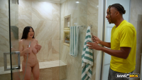 with his friend and they talk about his hot stepsister. That she has the perfect set of big tits and huge booty. As he is talking, she is showering, and