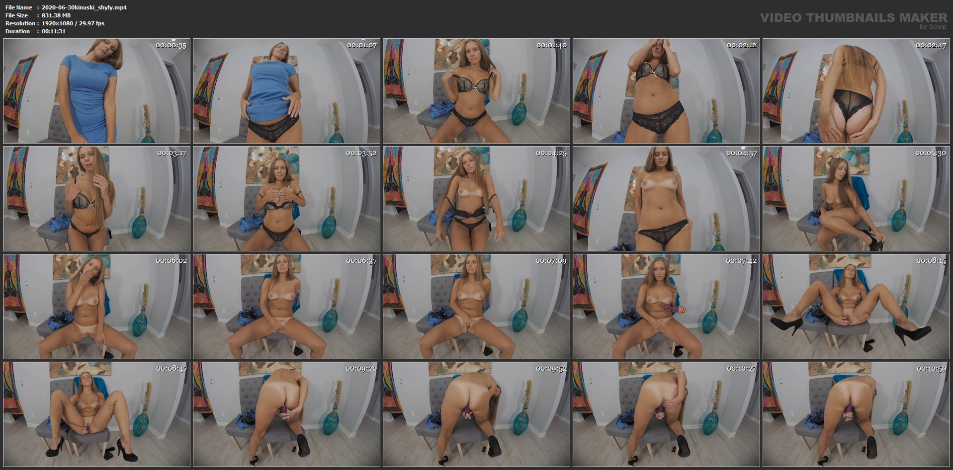 Описание: Kinuski is new at this and talks with a shy voice at first. Don’t let this trick you into thinking she’s not freaky. She takes off her clothes and remains with her black panties and bra. with a little bit of teasing, she gives a sneak peek of what the panties are covering; a tight clean-shaven pussy… kind of like that of a mature teen but hairless. She likes playing with it… gently rubbing her fingers over it. This is right after she gets totally naked and sits back on a bench. After she’s flicked her pussy for a while, Kinuski decides to use a dildo for a much more pleasurable experience. She gets herself excited with the big round tip and now that she’s super wet, she goes ahead and fucks herself with it. The dildo now looks a lot smaller than it actually is… probably because the biggest part is swallowed up. Kinuski tries a bunch of different positions for masturbation before she cums, finally. She gives the dildo a big nice slurp afterward; a special thank you for helping her cum. Still naked on the bench, she leans back a bit and gives a kiss to you too.