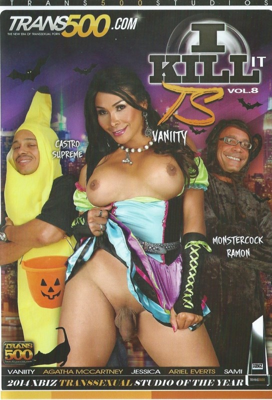 The eighth film in the I Kill It TS series begins with Castro Supreme and Ramon plotting to get some pussy on Halloween. They dress up in a most respectable banana and monkey suit. Their first stop: Vaniity's place. Vaniity is dressed in a super cute and colorful skirt with knee high socks and a not so veiling red g-string. Vaniity starts by blowing them both at the same time and them doing a bit of face fucking. Then Castro starts fucking her doggy style while she blows Ramon and then Castro fucks her from behind while laying side by side. Ramon removes himself from the picture for a bit and Castro keeps fucking her on her side while he's standing. Next, it switches to Vaniity riding Ramon's cock reverse cowgirl while she's blowing Castro. Her uncut cock bouncing around is sexy as hell. Then Ramon fucks her on her side from behind while she blows Castro and then while she's on her back. They close the scene by first Ramon giving her a massive facial, then her jerking until she cums and then Castro Supreme giving her a facial. The next scene begins with Ariel Everts and Ramon outside the Luxor in Las Vegas. Ariel is in a black top and jeans. The scene quickly switches to them in a room together and Ariel downing Ramon's massive cock. After Ramon sizes up her ass a bit, she hops on his dick cowgirl and starts riding it. Then she flips around reverse cowgirl while holding her cock. After a bit, they switch to laying side by side on the couch while Ramon fucks her and then doggy stye and on her back. Ramon finishes by cumming on her cock and then Ariel strokes herself to completion. Following Ariel is Agatha McCartney she's dressed in some sexy black and red lingerie. After a bit of chatting she dives right in on the cock, giving him a really nice blowjob. After a bit, she hops on his cock reverse cowgirl with a raging boner she strokes a little while facing the camera. After a bit, they switch to cowgirl and then side by side with Ramon coming in from behind. Ramon switches to fucking her on top while she's on her back while she strokes herself and they both come at the same time, with Ramon cumming all over her tits. Busty blonde Jessica in a bright red top opens the next scene. The top is quickly removed though and we next see her massaging and playing with her tits which are much more natural looking than most. Ramon steps in and plays with her a bit and then she goes down on him. After a bit of head, Jessica takes him in doggy style and then she rides him reverse cowgirl and then takes him in while she lays on her side and strokes herself. Then it switches to her riding him reverse cowgirl and she comes shortly after. After a bit more riding, Ramon finishes by cumming on her tits. The closing scene is with sexy Asian Sami who is in a striped black and white top, short shorts and hoop earrings. They're quickly removed though and she shows off her body and her cute natural chest to open the scene. After a bit, Ramon steps in and she begins blowing him on a couch. After the warm up, it switches to Ramon fucking her doggy style, then to her riding him reverse cowgirl while she whimpers and moans she flips around cowgirl style and then they switch to fucking side by side. Ramon finishes with a huge facial and a smile.