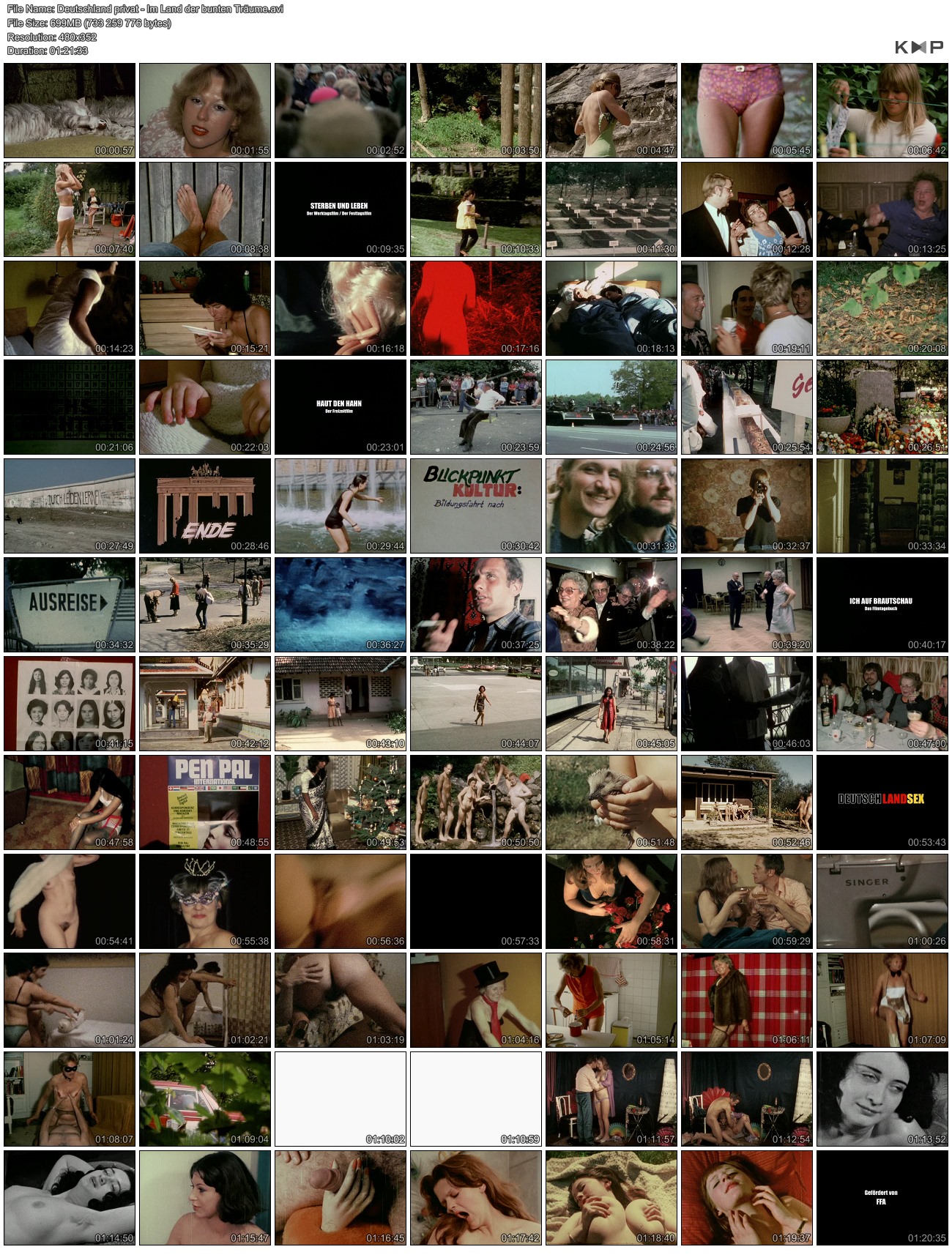 Описание: Robert van Ackeren, better known for his classic "Die flambierte Frau", made a sympathetic film from a diverse collection of home made 8mm movies - ranging from holiday scenes and a guy importing his bride from the Philipines in the first part to home made pornographic flics in the second. The first part has it's hilarious moments: a band of nudists is digging in the dirt behind their club house in the alps- and it has it's shocking moments when people on a party have to kill a cock hanging from a rope by hitting his head. The porn stuff actually is so bad it's already good again.