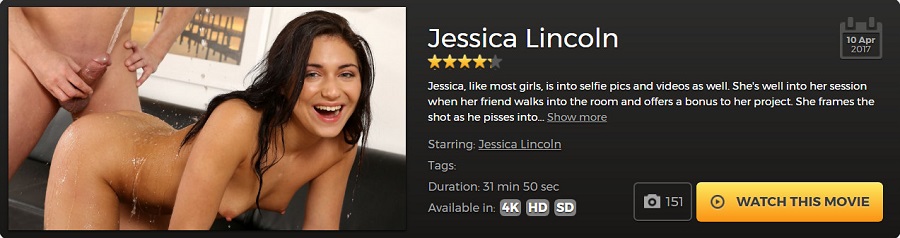 Описание: Jessica, like most girls, is into selfie pics and videos as well. She's well into her session when her friend walks into the room and offers a bonus to her project. She frames the shot as he pisses into her mouth and tries to keep a steady hand as she begins to lose focus on her selfie job. Her satin black shorts are now shinier and damp with piss. Jessica now gives her friend a nice dick shower and they move on to the intercourse action. After another manly piss from her friend, Jessica moves to a more explicit position, continuing with the sexual action. As the action takes a pause, Jessica is ready for another piss. This one takes here a moment to get going, but she has some great powerful and sustained streams. By now Jessica is having a great time and again she takes a piss after her friend, this time legs wide open and aiming for a giant container. She takes a couple more showers from her friend before standing up and posing sexily.