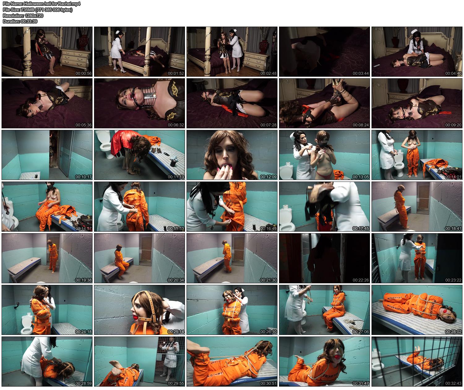 Описание: Rachel comes home from Halloween really drunk. She slumps onto her bed while texting. When she wakes up a nurse is in there that talks to her about having a drinking and pill problem. Rachel tries to defend herself but she finds herself being cuffed at the wrists and ankles by the woman who then puts a metal posture collar on her and hogcuffs her with a chain. Shortly thereafter she puts an open mouth gag in her mouth so she can't yell and bother her neighbors. A few minutes late the woman comes to take her away. The scene cuts to Rachel and the nurse in a cell. The nurse tells her that this is part of he treatment to get better. She gets into orange pants, gags herself, and is straitjacketed. The nurse leaves and the woman paces around for a few minutes before she returns and changes her gag to a harness ballgag and then ties her up with rope and hogties her on the bench. She leaves Rachel again......A few minutes later Rachel wakes up in her bed at home. Her Xena costume is missing and some of the kinky medical things are on her bedstand. What happened to her that Halloween night?