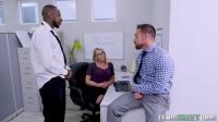 Zoey Monroe is the sexy new blonde bombshell heating up the office lately. The guys at work are talking by the water cooler when lo and behold, Zoey walks into the room. Enthralled by her curvy body, the guys set out to fuck her. The first dude makes his move and quickly finds Zoey on her knees sucking his cock under his desk, when his buddy shows up talking about the Clippers game last night. Its awkward but not awkward enough to knock that dick out of her mouth. Later that afternoon, she quenches her craving for dark meat when she corners her other coworker in the bathroom and sucks his big black cock. The other dude walks in and interrupts them, kicking their friendly rivalry into overdrive. The guys talk and decide they will let Zoey decide which one she wants more. When they walk over to her desk and ask the question, Zoey lets them know that she doesnt want to pick one...when she could just have them both. The guys are happy to fulfill her fantasy, and double stuff her pussy like an Oreo cookie. This cock crazed slut sucks both their cocks as they shoot their loads all over her face.