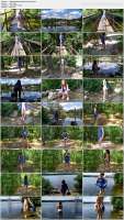 Нудистка светит писькой возле реки.