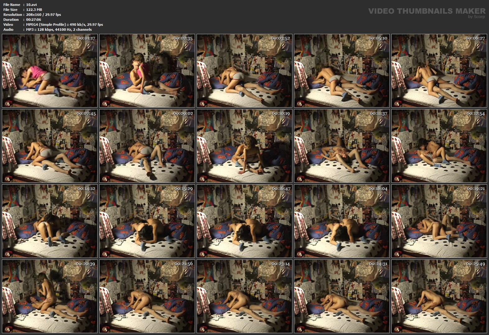 Video: 208x160 (1.30:1), 29.970 fps, DivX Codec 5.x or 6.x ~289 kbps avg, 0.29 bit/pixel