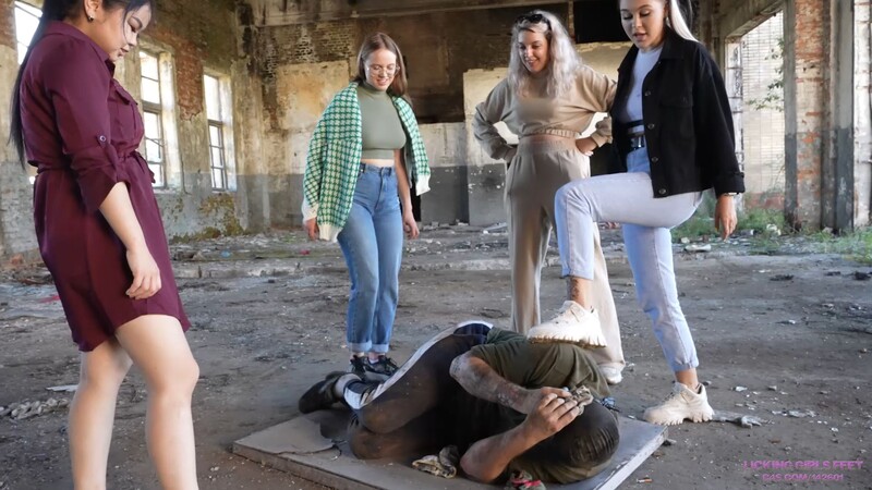Nicole, Jane, Lana and Sakura hate this fat idiot, in their opinion, he is a complete nonentity and a loser. Today she decided to show him his place .. They brought him to an abandoned building to have fun and humiliate him. This dirty pig obeys all the girls' orders .. eats the ground, catches their spit, licks their dirty sneakers, dips his head in machine oil and much more .. This fat guy is even sometimes funny for girls and they laugh at him .. They don't understand how he can be such a pathetic loser .. just look at him! He was born to be humiliated! Today is a fun day for girls, which can't be said about this dumbass.