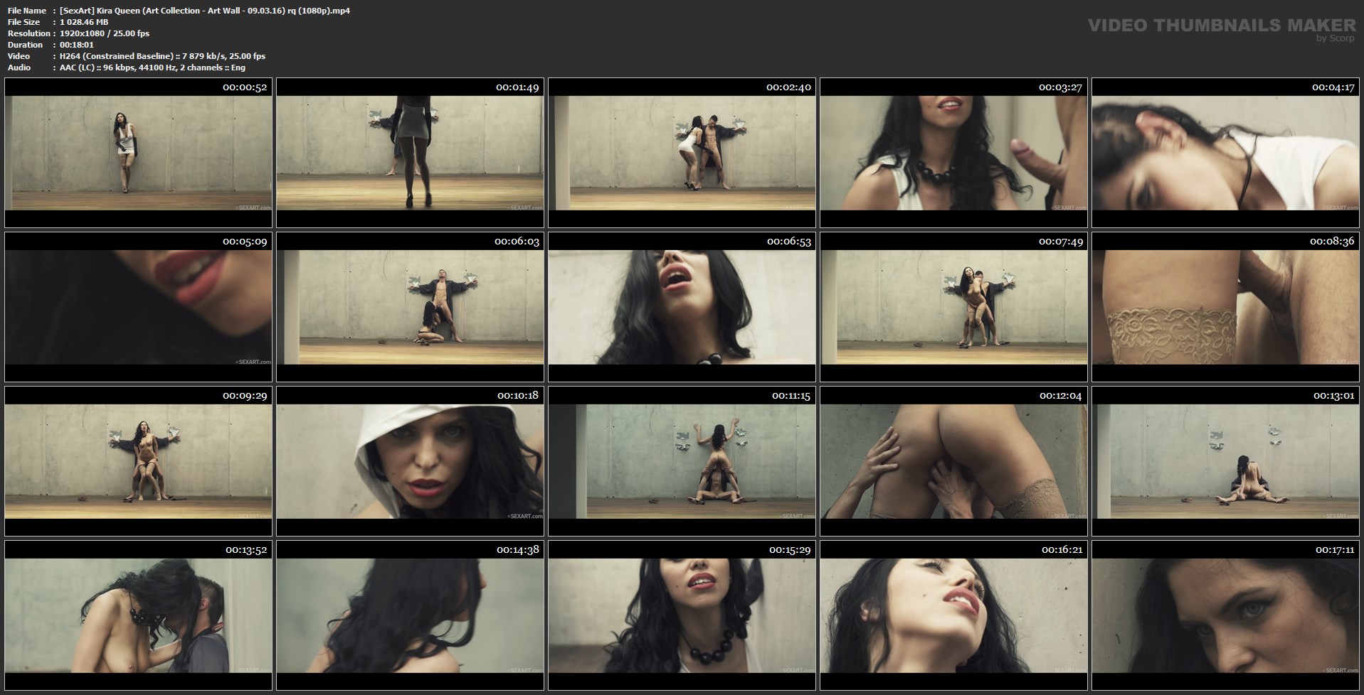 Kira Queen introduces director Andrej Lupin’s disturbing and provocative new “Art Collection” series by pulling on a pair of elbow length black gloves, her posing overtly sexual. Predatory in skyscraper heels and a dress that hugs her voluptuous figure, she eyes her prey, Jayden Cox, who is restrained to the titular “Wall.” As she approaches and disrobes him, Cox looks apprehensive, but his rising erection betrays another emotion too: excitement. Kira’s gloved hand wraps around his cock, stroking it to rigidity before she kneels to suck it deep. She peels off her dress and squeezes her big breasts around his bone, then bends over and backs onto it, grinding it against the groove of her pussy lips and then guiding it inside. Kira rubs her clit as she slams back onto her captive’s cock, moving faster and harder before abruptly pulling away, leaving him gasping. She frees his wrists and he sinks to the ground, where she straddles him to get her pussy eaten, and then sits astride him and rides vigorously. She spins around into reverse cowgirl, breasts bouncing as they hump to a simultaneous orgasm. A hint of tenderness between the pair belies the unsettling, challenging and highly charged atmosphere of this extraordinary piece of erotic filmmaking.