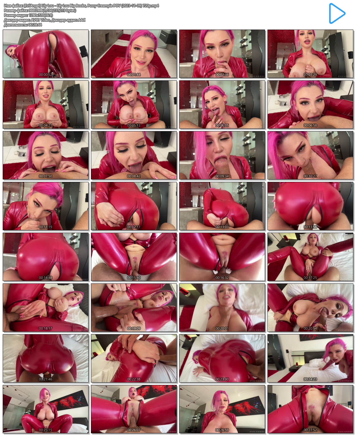 Описание: Busty, beautiful porn model Lily Lou wears a tight, shiny red catsuit with clear heels, checking herself out in the mirror to initiate a stellar tease. The bodacious vixen unzips, talking dirty while her big boobs spill out. Strikingly gorgeous with her hair dyed pink, Lily sinks to hands and knees and crawls to top director/performer Mick Blue, taking his big cock into her mouth. Lily gives a messy opening blowjob, incorporating a spit-slickened titty fuck and a nasty rim job into her repertoire! She flaunts her chunky booty and opens the catsuit bottom so Mick's prick can easily slide into her slit. Lily whimpers as he pounds her poon, riding wildly while Mick thrusts away. She lies spread-eagled on the bed, her humongous jugs bouncing while Mick bangs her box. The private, one-on-one date features intimate, POV shooting. Orgasmic sex climaxes with an oozing pussy creampie!