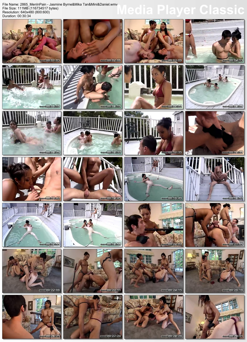 2865_MenInPain - Jasmine Byrne&Mika Tan&Mini&Daniel Duration: 30 мин 34 сек (0:30:34.752) Video: WMV3, 320x240 (4:3) 14,99 Гц VBR:(N/A) File Size: 111,33 MB Download: Вам необходимо ЗАРЕГИСТРИРОВАТЬСЯ НА ФОРУМЕ, чтобы скачать файл.