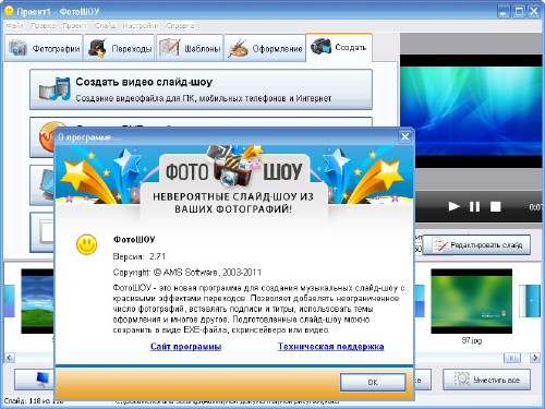 ФотоШОУ — это новая русская программа от компании AMS Software для создания музыкальных слайд-шоу с красивыми эффектами переходов. Позволяет добавлять фотографии без ограничений, вставлять подписи и титры, использовать темы оформления и т.д. Готовое слайд-шоу можно сохранить в виде .EXE, скринсейвера или видео, в том числе HD-качества, конвертировать в видео различных форматов, публиковать в Интернете (YouTube, RuTube, ВКонтакте), просматривать на мобильных устройствах. Имеет удобный и лёгкий в освоении интерфейс.