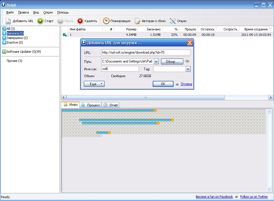 Orbit Downloader - менеджер закачек файлов из Интернета. Данная программа закачивает файлы в многопоточном режиме, поддерживает интеграцию с различными браузерами (Internet Explorer, Opera, FireFox и Maxthon), может закачивать файлы, расположенные в файлообменных сервисах, в частности, с RapidShare.com. Программа не требовательна к ресурсам компьютера. Orbit Downloader позволяет скачивать файлы по многим протоколам (HTTP, HTTPS, FTP, RTSP и MMS), может просматривать содержимое ZIP-файла до его скачивания и автоматически загружать файлы по расписанию, а также имеет расширенные настройки для работы через прокси-сервер. Предусмотрена возможность сохранения на компьютере флеш-роликов и потоковых аудио/видео данных, встречающихся на веб-сайтах. Если Orbit Downloader распознает такой тип контента на веб-странице, то он автоматически выводит на нем специальную кнопку для скачивания.