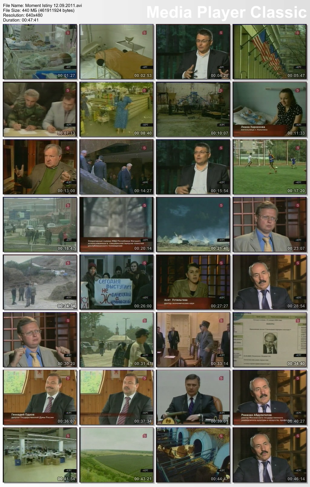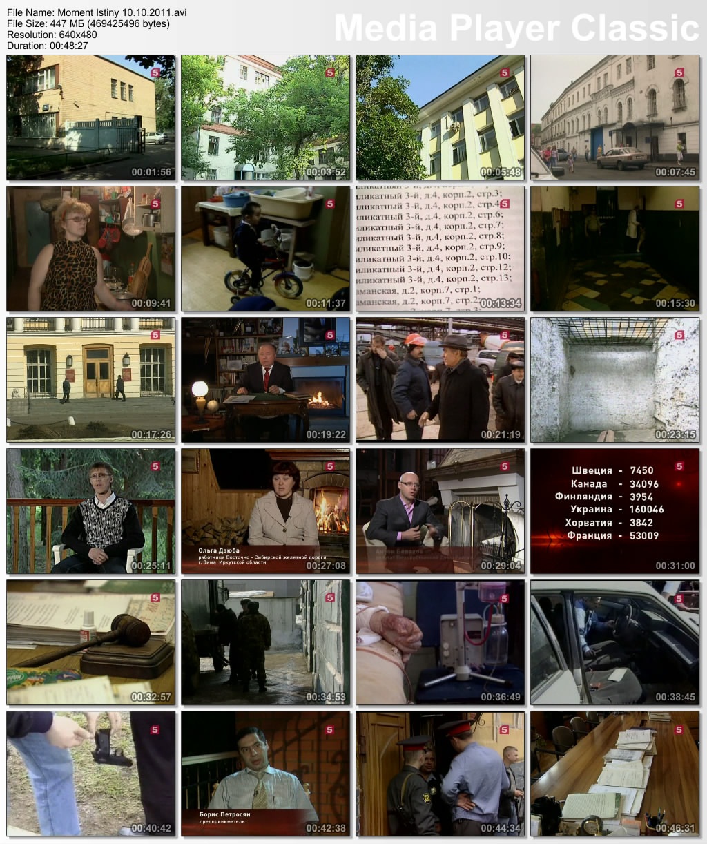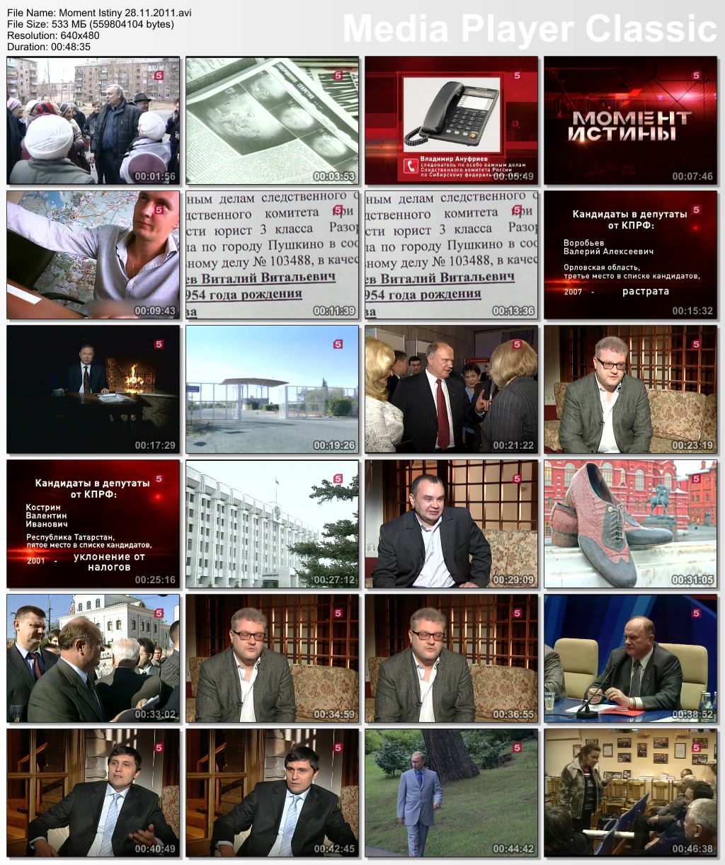 Информация о фильме:Название: Момент истины Год выпуска: 2011 Выпущено: Россия, Пятый канал Жанр: Документальный, Информационно-аналитическая программа Перевод: Не требуется Ведущий: Андрей Караулов В ролях: Андрей Караулов и другие Описание:«Момент истины» - авторская программа журналиста Андрея Караулова, в которой известные писатели, артисты и другие деятели культуры и политики обсуждают злободневные для России темы: коррупция в высших эшелонах власти, вырождение нации, наркомания среди молодежи, падение рождаемости и др. Информация о файле:Формат: AVI Видео: XviD, 640x480 (1.33:1), 25 fps, ~1151 kbps avg, 0.15 bit/pixel Аудио: MP3, stereo, 2 ch, 44.1 kHz, ~128.00 kbps avg Качество: SATRip Выпуск от 20.06.2011.Михаил Ходорковский. Банк Менатеп. История с захватом дома в Колпачном переулке (Москва) Убийство мэра г. Нефтеюганск - Петухова в 1998 году. Кому это было выгодно «Юганскнефтегаз» был рейдерски захвачен компанией под управлением М. Ходорковского «ЮКОС» Выживший во время убийства мэра г. Нефтеюганск - юрист местной администрации, оставшийся инвалидом, не признан потерпевшим Перехваченый телефонный разговор Леонида Невзлина (правая рука Ходорковского, обвинененный в убийстве и скрывающийся за границей) и Алексея Кондаурова (бывший менеджер компании «ЮКОС». Генерал-майор ФСБ в отставке. депутат ГосуДумы, член фракции КПРФ) Исчезновение супругов Гориных из Тамбова, имевших отношение к "Банде Пичугина" Открытое письмо Михаила Ходорковского о фактах изложенных в д/ф "Ходорковский. Тру(б)пы" Продолжительность: 00:47:25 Размер: 437 МБ Скачать: Вам необходимо ЗАРЕГИСТРИРОВАТЬСЯ НА ФОРУМЕ, чтобы скачать файл.