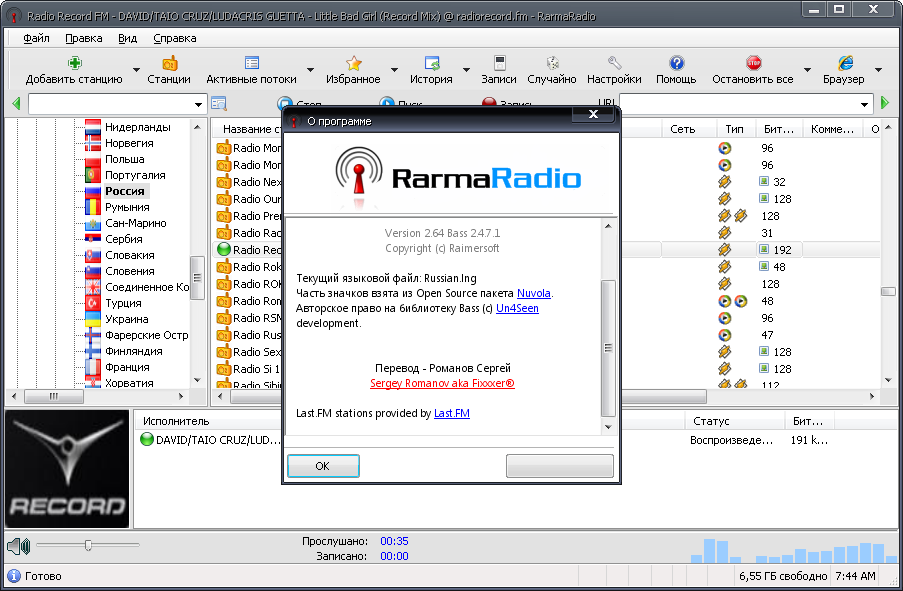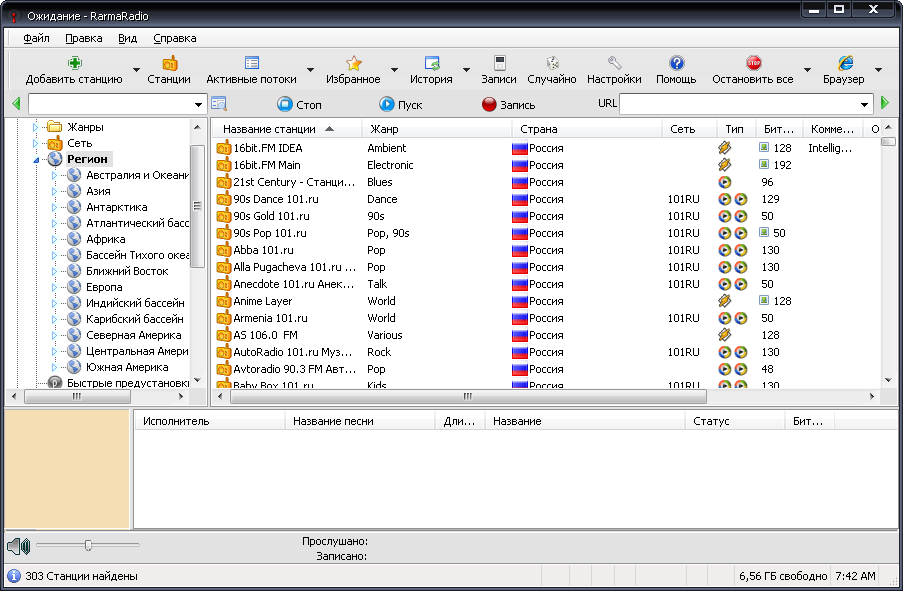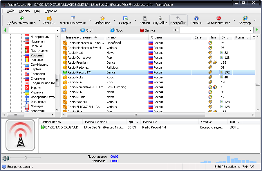 RarmaRadio - программа для прослушивания и записи интернет-радиостанций. Обладает большим набором возможностей, обеспечивая комфортное прослушивание радиостанций и удобную запись транслируемых данных. Программа содержит множество станций рассортированных на группы в зависимости от жанра музыки, битрейта, сети и региона, имеет функцию поиска станций, автоматически скачивает из Интернета информацию о проигрываемых песнях, включая альбомную графику, и поддерживает подключение плагинов медиаплеера Winamp. С помощью RarmaRadio можно слушая одну станцию, одновременно записывать несколько других интернет-радиостанций, осуществлять запись интернет-вещания по расписанию, а также автоматически начинать запись, в случае если заиграла определенная композиция. При сохранении полученных аудио файлов RarmaRadio добавляет в них теги.