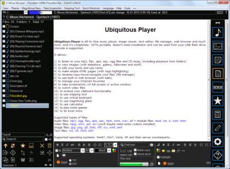 Ubiquitous Player - универсальный файловый менеджер, имеющий возможность проигрывать аудио и видео, просматривать фотографии и включающий в себя текстовый редактор. Помимо вышеперечисленного, Ubiquitous Player имеет встроенный интернет-браузер. Ubiquitous Player поддерживает такие типы файлов как: BMP, ICO, WMG, EMG, JPEG, JPG, PNG, GIF, TIFF, HTML, MHT, MPG, MPE, AVI, WMV, WMA, ASF, MP3, TXT, RTF, WAV, PPL, MOV, PDF и много других.