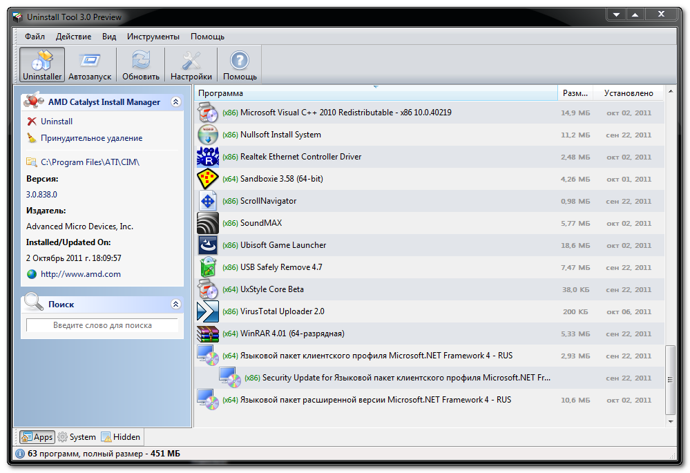 Glary Utilities - функциональный набор системных твикеров и утилит, для тонкой настройки, повышения общего уровня производительности и защиты ПК. Данное приложение позволяет пользователю избавиться от ненужных файлов, от устаревших регистрационных записей и истории интернет-активности, посредством установки различных плагинов, можно добиться полной совместимости данного приложения с более чем 45 различным программами. Более того, Glary Utilities оптимизирует процесс использования системной памяти, осуществляет поиск, а также исправление или удаление неработающих ярлыков, редактирование списка программ, загружающихся вместе с операционной системой, и удаление указанных приложений. Имеет поддержку Windows Vista и многоязычный пользовательский интерфейс, включая поддержку русского языка.
