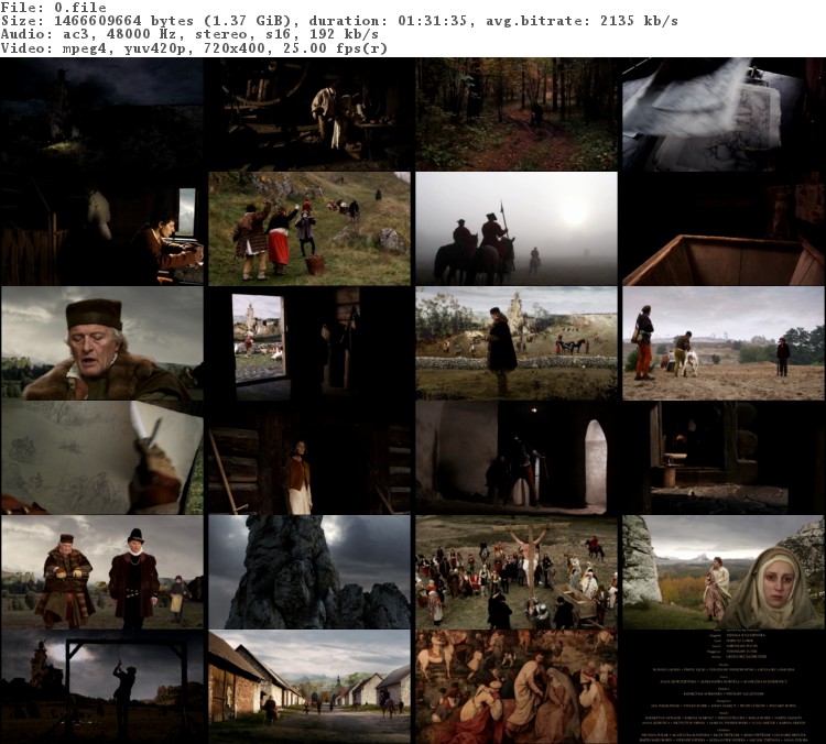 Описание: Фильм приглашает зрителя в мир живописи Питера Брейгеля, полный скрытых символов и подсказок. В основе фильма лежит написанный в 1564 году шедевр Питера Брейгеля "Путь на Голгофу", созданный на сюжет Страстей Христовых. Картина Леха Маевского представляет собой фантазию на тему судеб десяти персонажей, которых можно увидеть на знаменитом полотне (в их числе - Дева Мария), самого Питера Брейгеля и антверпенского купца, коллекеционера предметов искусства Николоса Йонгелинка, по заказу которого художником было создано несколько картин.
