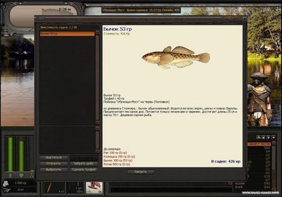 Во время рыбалки вы можете поймать не только обычную рыбу, но и всевозможных рыб мутантов. Во время игры вы так же можете общаться в чате, не прекращая ловли, для удобства общения имеется несколько чатов - это и общий, по локациям, и турнирный. Начав играть в разряде рыболова – испытателя вы постепенно переходите в разряд профессионалов. Игра очень интересная и не требует реальных денежных вложений, а небольшой объем трафика в пределах 600-700 КБ/час делает ее доступной для всех пользователей интернета.