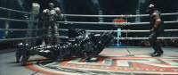О фильме: События фильма происходят в будущем, где бокс запрещен за негуманностью и заменен боями 2000-фунтовых роботов, управляемых людьми. Бывший боксер, а теперь промоутер, переметнувшийся в Робобокс, решает, что наконец нашел своего чемпиона, когда ему попадается выбракованный, но очень способный робот. Одновременно на жизненном пути героя возникает 11-летний пацан, оказывающийся его сыном. И по мере того, как машина пробивает свой путь к вершине, обретшие друг друга отец и сын учатся дружить.