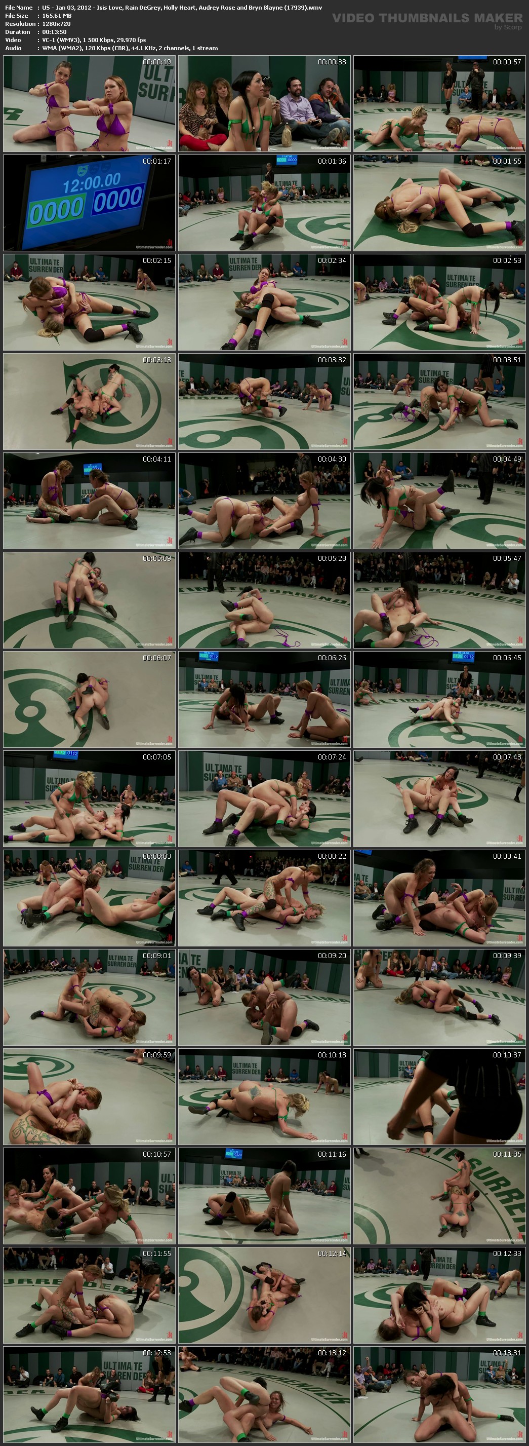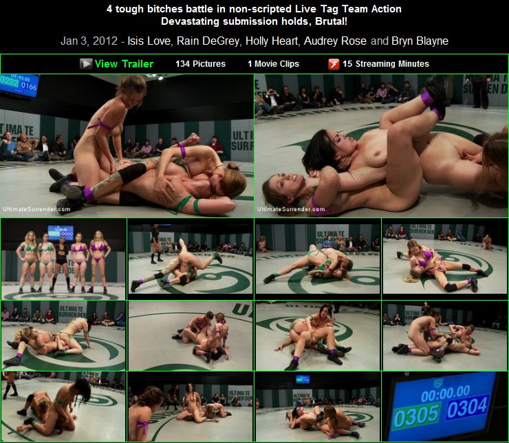 Описание/Description: Welcome to Tag Team Tuesdays. Totally non-scripted, all in front of a live audience, all broadcast live to members. Today's update is RD 1 of 4. This was December's live match now edited for your enjoyment! This round had everything you have come to love about the non-scripted competitive wrestling here at Ultimate Surrender. Intense one-on-one action and brutal sexual tag team 2 on 1's. All four girls wrestle their asses off for 12 minutes, and at the end of the first round only 1pt separates the two teams. If you have never seen a non-scripted tag team match before this is the one you want to check out first! Authentic sexual lesbian wrestling, the only of its kind in the world!