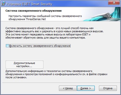 Снять галку "Включить систему своевременного обнаружения" - Далее