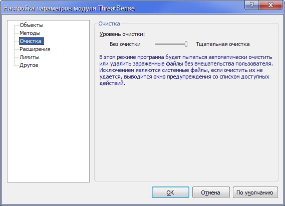 В левом окне - Настройка - Защита от вирусов и шпионских программ - справа кнопка "Настройка" - Очистка - ползунок в положение "Тщательная очистка" - ОК.