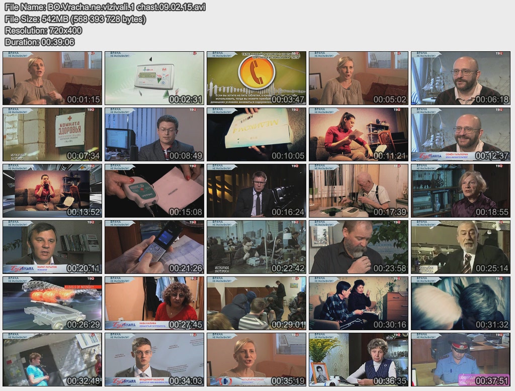 Информация о фильме.Название: Врача не вызывали? Оригинальное название: Без обмана. 2 части Год выхода: 09.02.2015 и 11.02.2015 Жанр: Документальный Страна: Россия Продолжительность: 00:39:06+00:39:19 Язык: Русский О фильме:На фоне реформы здравоохранения в России расцвела альтернативная медицина – люди лечатся сами, покупают всевозможные "лечебные приборы", посещают аномальные зоны… Почему мы вернулись в лихие девяностые, когда большинство жителей страны верило в экстрасенсов и заряжало воду, сидя у телевизоров? Об этом и не только в очередном выпуске программы "Без обмана" Файл:Качество: SATRip Формат: AVI Видео: XviD; 720x400, 25.000 fps, 1800 Kbps Аудио: MP3; 48000 Hz, 128 kbps, 2 Channel Размер: 542.06 МБ +435 МБ Скачать 1 часть: Вам необходимо ЗАРЕГИСТРИРОВАТЬСЯ НА ФОРУМЕ, чтобы скачать файл.