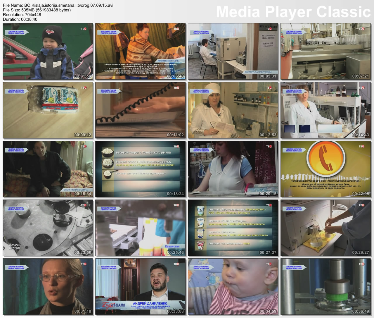 Информация о фильмеНазвание: Кислая история: кефир и йогурты Оригинальное название: Без обмана. Год выхода: 31.08.2015 Жанр: Документальный Страна: Россия Продолжительность: 00:39:00 Язык: Русский О фильме: Производители молочной продукции идут на разные ухищрения, чтобы выгодно для себя продать произведенный ими продукт. Как часто недобросовестные производители выдают свои некачественные подделки за натуральные кисломолочные продукты? Может ли потребитель обнаружить фальсификат без экспертизы? Как отличить натуральный продукт от коктейля из антибиотиков и стабилизаторов? Файл:Качество: SATRip Формат: AVI Видео: Xvid; 704x448; 1799kbps; 25.00fps Аудио: MPEG Audio Layer 3; 48000Hz; stereo; 128kbps Размер: 536.24 МБ Скачать: Вам необходимо ЗАРЕГИСТРИРОВАТЬСЯ НА ФОРУМЕ, чтобы скачать файл.