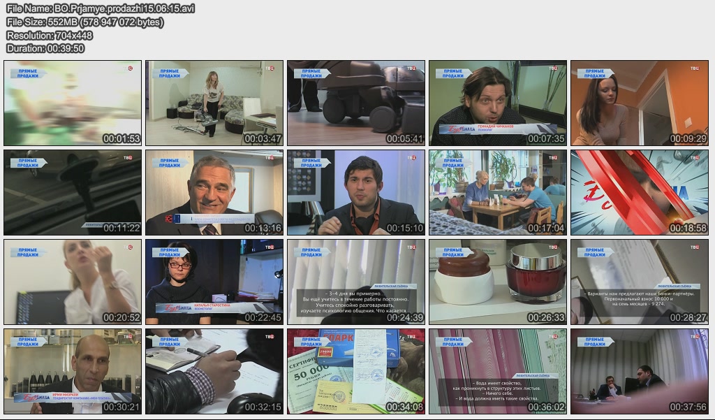 Информация о фильме.Название: Прямые продажи Оригинальное название: Без обмана. Год выхода: 15.06.2015 Жанр: Документальный Страна: Россия Продолжительность: 00:39:00 Язык: Русский О фильме: Сотни россиян, отдавших десятки и даже сотни тысяч рублей за товары сомнительного качества, даже не думали совершать покупку, когда открывали дверь непрошеным гостям. Все они стали жертвами агрессивных прямых продаж. Кто и как попадается на удочку? Какие методы психологического воздействия используют недобросовестные продавцы? Как противостоять навязчивым дистрибьютерам косметики, пылесосов, фильтров, БАДов? Ответы на эти вопросы зрители получат, посмотрев программу "Прямые продажи" из цикла "Без обмана". Файл:Качество: SATRip Формат: AVI Видео: Xvid; 704x448; 1799kbps; 25.00fps Аудио: MPEG Audio Layer 3; 128kbps; 48000Hz; stereo Размер: 552.13 МБ Скачать: Вам необходимо ЗАРЕГИСТРИРОВАТЬСЯ НА ФОРУМЕ, чтобы скачать файл.