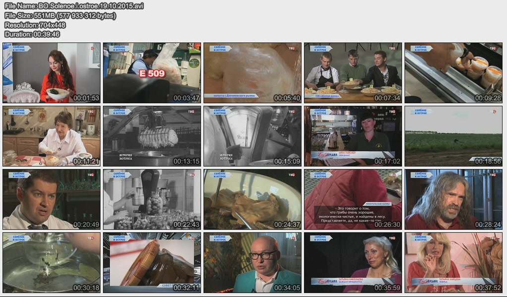 Информация о фильме.Название: Солёное и острое Оригинальное название: Без обмана. Год выхода: 19.10.2015 Жанр: Документальный Страна: Россия Продолжительность: 00:39:00 Язык: Русский О фильме: Миллионы россиян каждый день поглощают маринованные огурцы и квашеную капусту, корейские салаты и оливки из банок, всевозможные "лечо" и "закатки" фабричного и домашнего производства. Как выбрать продукты, которые наносят минимальный ущерб здоровью? Об этом и не только смотрите в очередном выпуске программы "Без обмана". Файл:Качество: SATRip Формат: AVI Видео: Xvid; 704x448; 1799kbps; 25.00fps Аудио: MPEG Audio Layer 3; 48000Hz; stereo; 128kbps Размер: 551.16 МБ Скачать: Вам необходимо ЗАРЕГИСТРИРОВАТЬСЯ НА ФОРУМЕ, чтобы скачать файл.