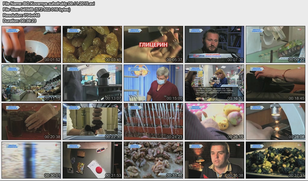 Информация о фильме.Название: Коварные сухофрукты Оригинальное название: Без обмана. Год выхода: 09.11.2015 Жанр: Документальный Страна: Россия Продолжительность: 00:39:00 Язык: Русский О фильме: Любите курагу, чернослив, изюм и прочие сухофрукты? Давайте искать такие, что не обработаны диоксидом серы. Считаете полезными их для здоровья? Давайте разберёмся, сколько в них сахара и калорий. Сухофруктов просто море, но плавать в нём надо очень осторожно! Об этом и не только смотрите в очередном выпуске программы "Без обмана". Файл:Качество: SATRip Формат: AVI Видео: XviD; 704х448; 1800 kbps; 25 fps Аудио: MPEG Layer 3, 48 kHz, 2 ch, ~128.00 kbps Размер: 545.98 МБ Скачать: Вам необходимо ЗАРЕГИСТРИРОВАТЬСЯ НА ФОРУМЕ, чтобы скачать файл.