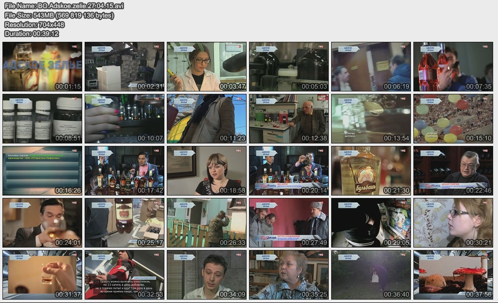 Информация о фильме.Название: Адское зелье Оригинальное название: Без обмана. Год выхода: 27.04.2015 Жанр: Документальный Страна: Россия Продолжительность: 00:39:12 Язык: Русский О фильме:Алкоголь с различными добавками, настоенный на ягодах, фруктах и других дарах природы, на Западе принято пить маленькими рюмочками, и не во время еды, а до, вместо или после! А наши потребители запивают настойками пельмени и пьют их, как вино - бокалами... Что за жидкость попадает в их желудки? Файл:Качество: SATRip Формат: AVI Видео: Xvid; 704x448; 1799kbps; 25.00fps Аудио: MPEG Audio Layer 3; 128kbps; 48000Hz; stereo Размер: 543.42 МБ Скачать: Вам необходимо ЗАРЕГИСТРИРОВАТЬСЯ НА ФОРУМЕ, чтобы скачать файл.