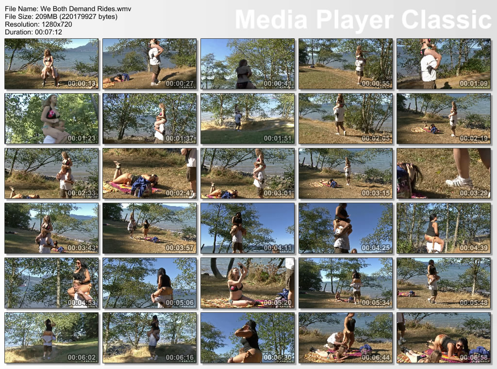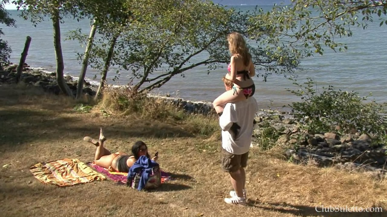 It was a wonderful day for a picnic at the ocean. The sun was shining and the Mistresses were enjoying themselves very much. But something was missing. They felt that slave gaspman could be more useful if he gave them fun shoulder rides up and down the path. First Mistress T mounted him and with tugs on his hair and little kicks from her cowboy boots, she directed him for a nice ride. Sometimes she would make him stop so she could simply enjoy the scenery. Sometimes she would make him trot faster so she could really feel his neck between her thighs. She rode him over to where Goddess Samantha was lying on the blanket. Goddess Samantha started taking photos of Mistress T with her cell phone and the Mistresses were having a lot of fun. Eventually, Mistress T asked if Goddess Samantha wanted her ride now. Goddess Samantha was extremely eager to mount up and feel his muscles working beneath her. She exclaimed that it had been a long time since she had a shoulder ride. She rode him hard and eventually she posed for cell phone photos taken by Mistress T. It was a tremendous afternoon for ponyboy having two such beautiful women riding him and enjoying themselves as he toiled to please them. Shoulder riding fans will enjoy this. It is all natural riding with nothing scripted.