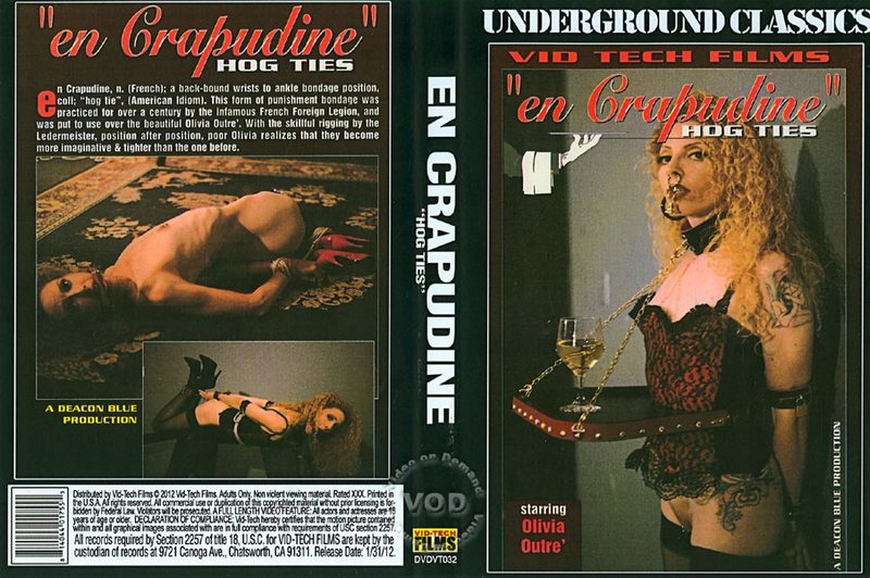 En Crapudine is a French term for a bondage position involving the wrists and ankles bound behind the back. This is otherwise known in English as “hog tied.” This form of bondage was developed over centuries by the infamous French Foreign Legion, and in this film it is put to use on the beautiful Olivia Outre. Skillfully rigged by the Ledermeister, poor Olivia realizes that the positions become more and more imaginative & tighter as they progress.
