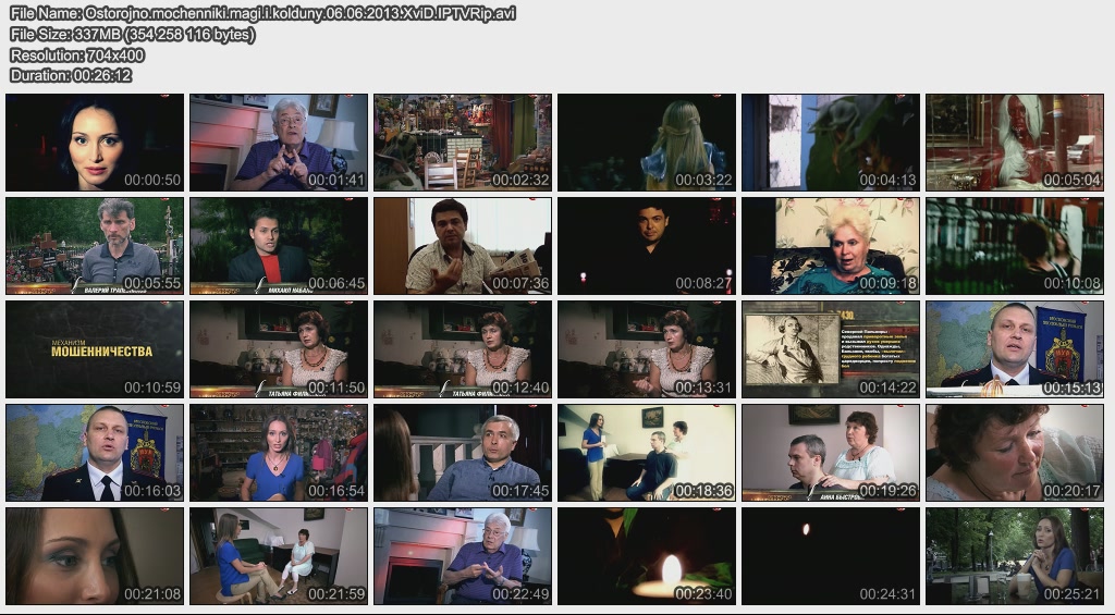 Информация о фильме.Название: Маги и колдуны Оригинальное название: Осторожно, мошенники! Год выхода: 06.06.2013 Жанр: Документальный Страна: Россия, ОАО "ТВ Центр" Продолжительность: 00:26:29 Язык: русский Ведущие: Вика Коломыцына, Игорь Швыткин и Олег Лобаков О фильме:Обращения за помощью к магии и колдовству в последнее время стали угрожать безопасности людей. Кто-то, приехав покорять Москву, пытается устроить личную жизнь и разбогатеть путём заговоров, а потом их находят мёртвыми. Кто-то, отчаявшись, не веря официальной медицине, за исцелением обращается к "волшебникам", которые разговаривают с их больными органами, попадает в психологическую зависимость от чудо-лекарей. Многие чудотворцы зарабатывают на невежестве бешеные деньги, но что делать, если люди сами хотят быть обманутыми? Как остановить этот колдовской беспредел? Файл:Формат: AVI Качество: IPTVRip Видео: XviD MPEG-4; 704x400 (1.33:1), 25 fps, ~1655 kbps avg, 0.18 bit/pixel Аудио: MPEG Layer 3, 48 kHz, 2 ch, ~128.00 kbps avg Размер: 337 Mb Скачать: Вам необходимо ЗАРЕГИСТРИРОВАТЬСЯ НА ФОРУМЕ, чтобы скачать файл.