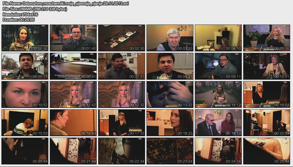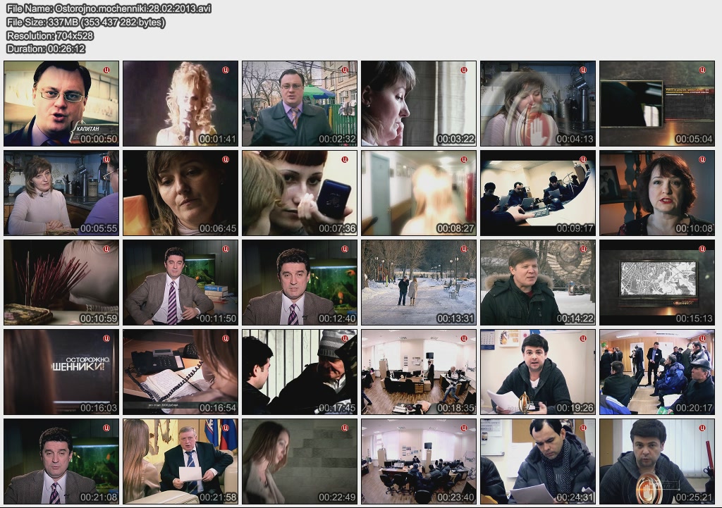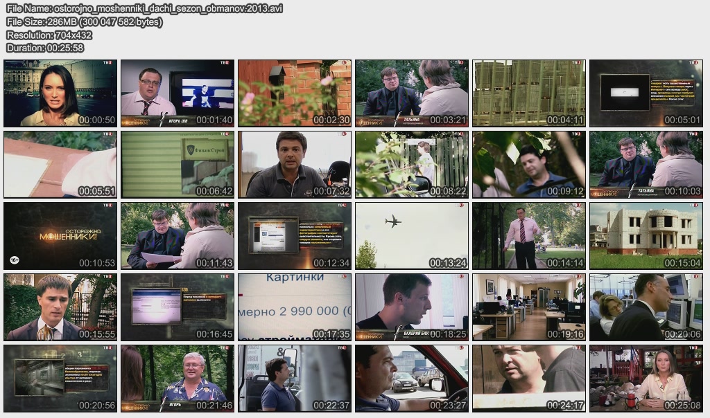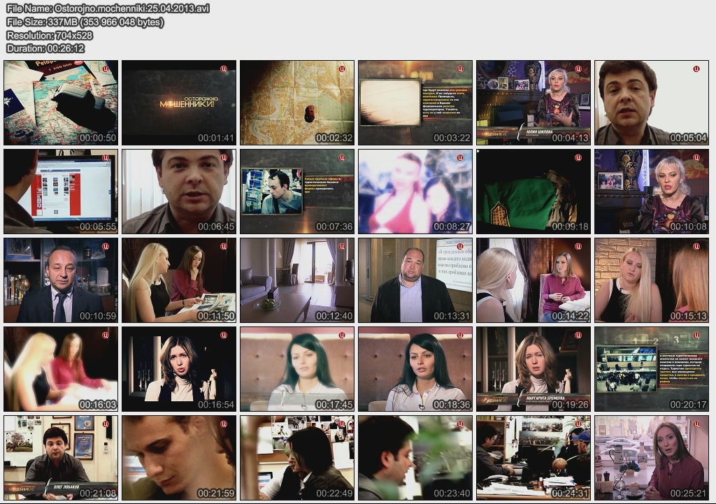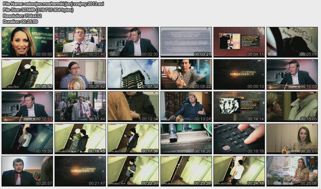 Информация о фильме.Название: Жизнь взаймы Оригинальное название: Осторожно, мошенники! Год выхода: 2013 Жанр: Документальный, расследование Страна: Россия, ОАО "ТВ Центр" Продолжительность: 00:25:58 Язык: русский Ведущие: Олег Лобаков, Виктория Черкасова, Игорь Швыткин О фильме:Москвичка Ольга Томаревская дала своей подруге в долг пять миллионов рублей. Выяснилось, что деньги подружка взяла не только у Ольги. Аферистка заняла крупные суммы у всех соседей по лестничной клетке, тайно продала свою квартиру и скрылась. Но нажиться на нашей доверчивости могут не только знакомые и близкие люди. Файл:Формат: AVI Качество: SATRip Видео: XviD; 704х432 (1.62:1), 25 fps, ~1500 kbps avg, 0.19 bit/pixel Аудио: MPEG Layer 3, 48 kHz, 2 ch, ~128 kbps avg Размер: 303 Mb Скачать: Вам необходимо ЗАРЕГИСТРИРОВАТЬСЯ НА ФОРУМЕ, чтобы скачать файл.