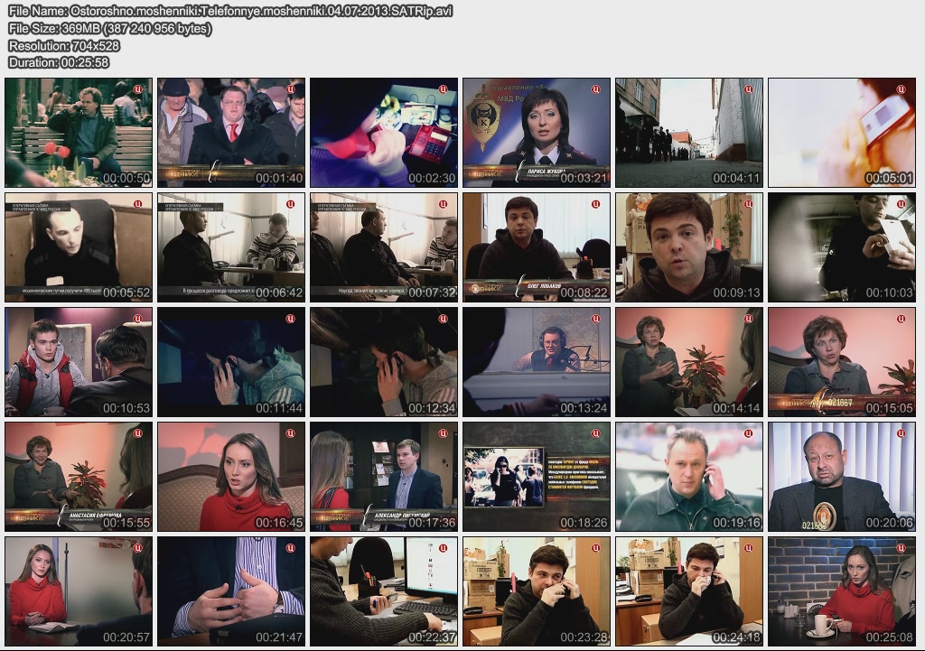 Информация о фильме.Название: Телефонные мошенники Оригинальное название: Осторожно, мошенники! Год выхода: 04.07.2013 Жанр: Документальный, расследование Страна: Россия, ОАО "ТВ Центр" Продолжительность: 00:25:58 Язык: русский Ведущие: Олег Лобаков, Виктория Черкасова, Игорь Швыткин О фильме:"Телефонные мошенники". Россию атакуют фродеры! Так называют телефонных мошенников. Преступники не дремлют, каждый день в их арсенале появляются новые схемы, чтобы отобрать деньги у доверчивых граждан. В основном спекулируют на алчности и родственных чувствах. Ольге Михайловой аферисты позвонили и сообщили голосом сына, что его забрали в милицию и нужно срочно привезти деньги. Известный режиссёр Роман Виктюк получил от фродеров sms, что его банковская карта заблокирована из-за сбоя в системе банка. Аферисты обманным путём заставили режиссёра играть по своим правилам и таким образом списали с его счета 400 тысяч рублей. Телефонное мошенничество пришло в Россию вместе с сотовыми телефонами. Сейчас счёт обманутых людей идёт на миллионы. Как только схемы устаревают, им на смену тут же приходят новые! В организации телефонных махинаций участвуют не одиночки а группы аферистов. Очень часто в такие группы входят злоумышленники отбывающий срок в колониях. Они отличные психологи и умело используют информацию, которую жертва невольно выдаёт при общении. Как не попасть в лапы телефонных аферистов? Файл:Формат: AVI Качество: SATRip Видео: XviD MPEG-4; 704x528 (1.33:1), 25 fps, ~1849 kbps avg, 0.20 bit/pixel Аудио: MPEG Layer 3, 44.100 kHz, 2 ch, ~128.00 kbps avg Размер: 369 Mb Скачать: Вам необходимо ЗАРЕГИСТРИРОВАТЬСЯ НА ФОРУМЕ, чтобы скачать файл.