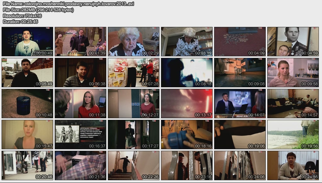 Информация о фильме.Название: Продавцы ненужных товаров Оригинальное название: Осторожно, мошенники! 19 выпуск Год выхода: 2013 Жанр: Документальный, расследование Страна: Россия, ОАО "ТВ Центр" Продолжительность: 00:25:45 Язык: русский Ведущие: Олег Лобаков, Виктория Черкасова, Игорь Швыткин О фильме:Они утверждают: только сегодня и только сейчас! Специально для вас, иголки без ушка и невидимые нитки, чудо-пылесосы и волшебные фильтры для очистки воды, скатерти-самобранки и утюги-самоглажки - словом, всё то, о чем вы всегда мечтали, но не знали, где это купить. И вот, свершилось! Уникальная вещь домашнего обихода у вас на пороге: одна по цене трёх! Торговые агенты, или продавцы ненужных товаров... Файл:Формат: AVI Качество: SATRip Видео: XviD; 704х416 (1.62:1), 25 fps, ~1500 kbps avg, 0.19 bit/pixel Аудио: MPEG Layer 3, 48 kHz, 2 ch, ~128 kbps avg Размер: 282 Mb Скачать: Вам необходимо ЗАРЕГИСТРИРОВАТЬСЯ НА ФОРУМЕ, чтобы скачать файл.