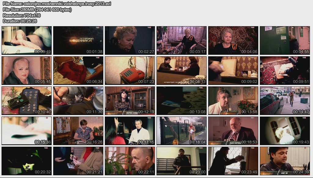 Информация о фильме.Название: Волшебные трусы Оригинальное название: Осторожно, мошенники! 23 выпуск Год выхода: 2013 Жанр: Документальный, расследование Страна: Россия, ОАО "ТВ Центр" Продолжительность: 00:25:45 Язык: русский Ведущие: Олег Лобаков, Виктория Черкасова, Игорь Швыткин О фильме:Охота на пенсионеров идет по всей стране, за приборы которым грош цена, несчастные старики отдают последние "кровные". Медицинские приборы от курьера - чудо техники, медицины, или лжи? Жизнь, или кошелек - что корректирует биокорректор? Продам семейные оздоровительные трусы - эффективность проверено на себе. Файл:Формат: AVI Качество: SATRip Видео: XviD; 704х416 (1.62:1), 25 fps, ~1500 kbps avg, 0.19 bit/pixel Аудио: MPEG Layer 3, 48 kHz, 2 ch, ~128 kbps avg Размер: 280 Mb Скачать: Вам необходимо ЗАРЕГИСТРИРОВАТЬСЯ НА ФОРУМЕ, чтобы скачать файл.