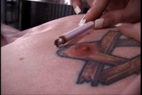 Mistress releases slave Lex from the cross and straps him into a large chare. She places his legs over the arms of the chair and teases his legs, his feet with her lit cigarette. Time for some serious cbt (cock & ball torture) as mistress begins binding Lex's cock in sturdy bright pink twine. When she finishes the bindings are tight. EXTREMELY tight. After torturing his thighs, torso and cock& balls with the Wurtenberg pinwheel, with the needle points paying lots of attention to the tip of Lex's bound cock, Mistress moves on to electrical torture. She sets her violet wand on the highest setting and begins focusing on Lex's cock and balls. We watch the electrical sparks jump from the wand to Lex's feet, to his legs, but most to the electricity is focused on the tip of his dick. Slave Lex, writhes in pain, his body contorting against the restraints.