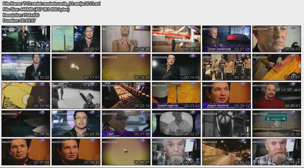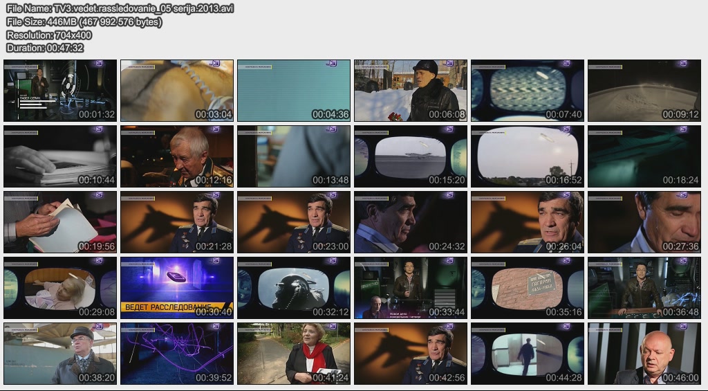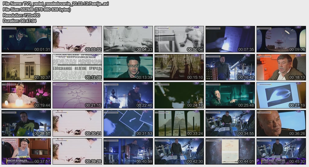 Информация о фильме.Название: Завербовать марсианина Оригинальное название: ТВ-3 ведет расследование. 5 серия Год выхода: 2013 Жанр: Документальный Страна: Россия Продолжительность: 00:47:32 Язык: Русский Ведущие: Павел Селин, Сергей Дружко О фильме:Летчики-испытатели всегда проходили особые курсы спецразведки, где их обучали механике реагирования на появление НЛО рядом с самолетом. Многие из этих людей после встреч умирали страшной смертью, а многие просто пропадали без вести. Файл:Качество: SATRip Формат: AVI Видео: MPEG-4, 704x400 (16:9), 1548 kbit/s, 25fps Аудио: MP-3, 192 kbit/s, 48Kz, stereo Размер: 446 MB Скачать: Вам необходимо ЗАРЕГИСТРИРОВАТЬСЯ НА ФОРУМЕ, чтобы скачать файл.
