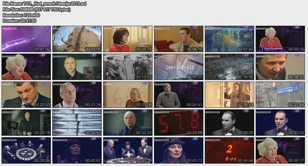 Информация о фильме.Название: Код смерти Оригинальное название: ТВ-3 ведет расследование. 19 серия Год выхода: 2013 Жанр: Документальный Страна: Россия Продолжительность: 00:47:50 Язык: Русский Ведущие: Павел Селин, Сергей Дружко О фильме:Страшные опыты над людьми доктора Менгеля — это опыты… над числами. Каббала утверждает — горы, леса, животные, человек и его смерть имеют численное значение. Файл:Качество: SATRip Формат: AVI Видео: MPEG-4, 720x400 (16:9), 1499 kbit/s, 25fps Аудио: MP-3, 128 kbit/s, 48Kz, stereo Размер: 588 MB Скачать: Вам необходимо ЗАРЕГИСТРИРОВАТЬСЯ НА ФОРУМЕ, чтобы скачать файл.