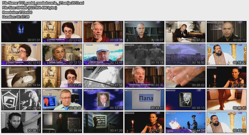 Информация о фильме.Название: Колдун для президента Оригинальное название: ТВ-3 ведет расследование. 8 серия Год выхода: 2013 Жанр: Документальный Страна: Россия Продолжительность: 00:47:13 Язык: Русский Ведущие: Павел Селин, Сергей Дружко О фильме:ТВ-3 проведет расследование, чтобы выяснить, как экстрасенсы в погонах защищали советское с помощью мистических практик и незаметно влияли на ход мировой истории. Файл:Качество: SATRip Формат: AVI Видео: MPEG-4, 720x400 (16:9), 1499 kbit/s, 25fps Аудио: MP-3, 128 kbit/s, 48Kz, stereo Размер: 554 MB Скачать: Вам необходимо ЗАРЕГИСТРИРОВАТЬСЯ НА ФОРУМЕ, чтобы скачать файл.