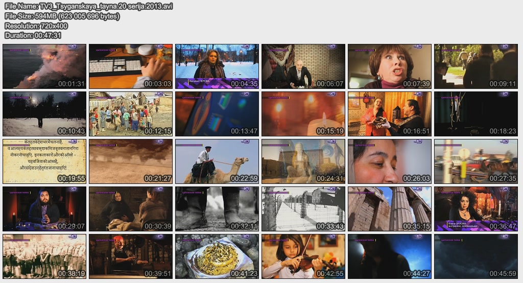 Информация о фильме.Название: Цыганская тайна Оригинальное название: ТВ-3 ведет расследование. 20 серия Год выхода: 2013 Жанр: Документальный Страна: Россия Продолжительность: 00:47:31 Язык: Русский Ведущие: Павел Селин, Сергей Дружко О фильме:Самая загадочная нация не вызывает приятных впечатлений при столкновении с ней. А все потому, что цыгане несут на земле особую магическую миссию и завоевывать наше расположение не входит в их планы. Файл:Качество: SATRip Формат: AVI Видео: MPEG-4, 720x400 (16:9), 1499 kbit/s, 25fps Аудио: MP-3, 128 kbit/s, 48Kz, stereo Размер: 594 MB Скачать: Вам необходимо ЗАРЕГИСТРИРОВАТЬСЯ НА ФОРУМЕ, чтобы скачать файл.