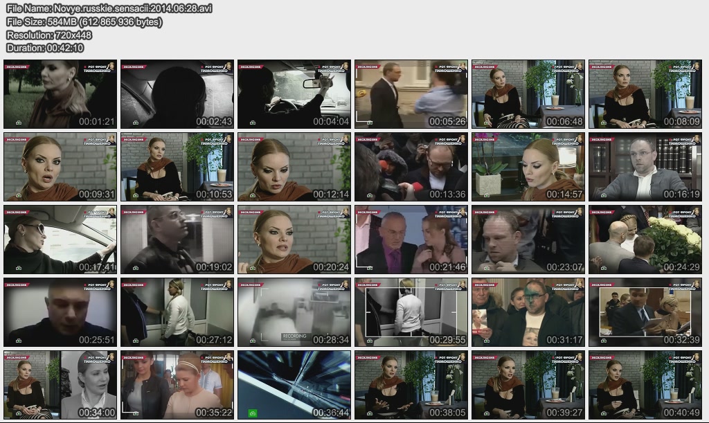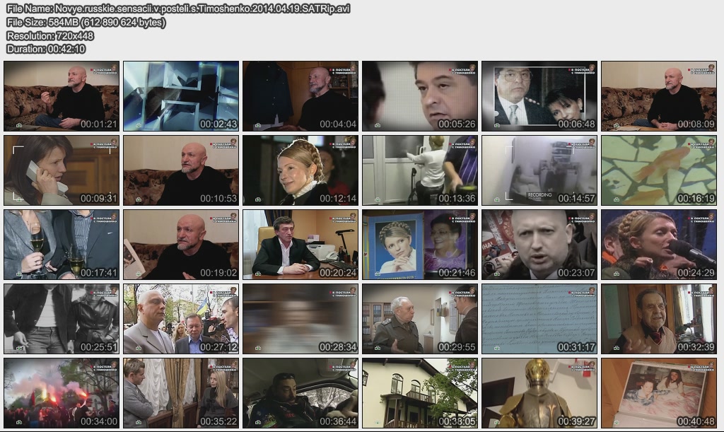 Информация о фильме.Название: В постели с Тимошенко Оригинальное название: Новые русские сенсации Год выхода: 19.04.2014 Жанр: Документальный, расследование Страна: Россия Продолжительность: 00:42:10 Язык: русский О фильме:Как Юлия Тимошенко увела мужа у фотомодели, с кем по ночам уединялась в гостинице Мюнхена и зачем разрушила брак родной дочери? Почему от нее сбежал единственный муж и как она сейчас успевает сражаться на личном фронте сразу с двумя фаворитами? Почему ее любовные похождения стали государственной тайной Украины и что грозит тем, кто знает подлинную историю Леди Ю? Файл:Формат: AVI Качество: SATRip Видео: XviD build 50; 720x448 (1.61:1), 25 fps, ~1799 kbps avg, 0.22 bit/pixel Аудио: MPEG Layer 3, 48 kHz, 2 ch, ~128.00 kbps avg Размер: 584 Mb Скачать: Вам необходимо ЗАРЕГИСТРИРОВАТЬСЯ НА ФОРУМЕ, чтобы скачать файл.