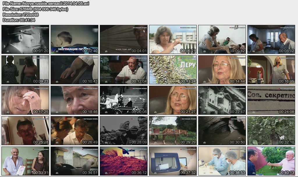 Информация о фильме.Название: Эксгумация Гитлера Оригинальное название: Новые русские сенсации. Год выхода: 05.04.2014 Жанр: Документальный Страна: Россия Продолжительность: 00:40:00 Язык: Русский О фильме:Впервые – сенсационные признания племянницы Геринга и детей фашистских вождей – сына Бормана, внучки Гиммлера. Неужели Гитлер умер в Бразилии совсем недавно? А также – тайна золота Третьего рейха. Что обнаружила экспедиция «Новых русских сенсаций» в таинственной могиле фюрера в Южной Америке? Уникальная эксгумация. Файл:Качество: SATRip Формат: AVI Видео: MPEG-4; 720x448, 1800 kbps; 25.00 fps Аудио: MP3; 48000 Hz, 128 kbps, 2 Channel Размер: 576.03 МБ Скачать: Вам необходимо ЗАРЕГИСТРИРОВАТЬСЯ НА ФОРУМЕ, чтобы скачать файл.