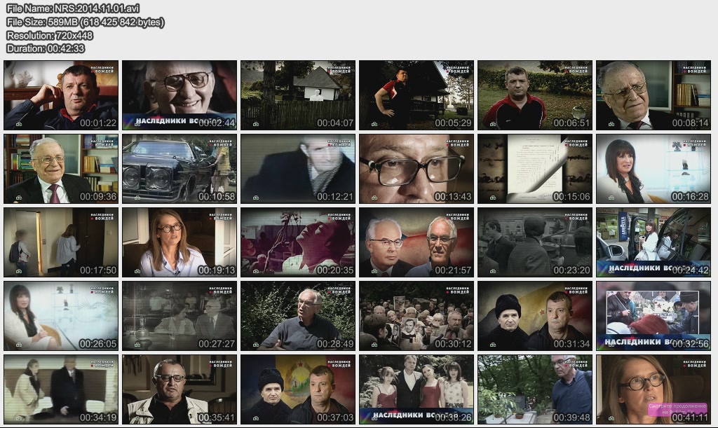 Информация о фильме.Название: Наследники вождей Оригинальное название: Новые русские сенсации. Год выхода: 01.11.2014 Жанр: Документальный Страна: Россия Продолжительность: 00:42:36 Язык: Русский О фильме:Наследники повелителей Восточной Европы — сын президента Чехословакии Гусака, внучка вождя Болгарии Живкова, племянник румынского диктатора Чаушеску, дочь президента Польши Ярузельского — как они пережили люстрацию и как теперь выживают в либеральной Европе? Как Горбачёв предал Живкова, кто из самых близких заказал расправу над четой Чаушеску, чего до сих пор боятся в семье Гусака и как долгие годы преследовали дочь Ярузельского? Файл:Качество: SATRip Формат: AVI Видео: MPEG-4; 720x448, 25.00 fps, 1800 kbps Аудио: MP3; 48000 Hz, 128 kbps, 2 Channel Размер: 589 МБ Скачать: Вам необходимо ЗАРЕГИСТРИРОВАТЬСЯ НА ФОРУМЕ, чтобы скачать файл.