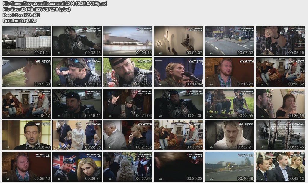 Информация о фильме.Название: Зять Тимошенко: Юля, гуд бай! Оригинальное название: Новые русские сенсации. Год выхода: 25.10.2014 Жанр: Документальный Страна: Россия Продолжительность: 00:43:36 Язык: Русский О фильме:Она была уверена, что он не заговорит никогда. Но она ошиблась… Впервые и только в «Новых русских сенсациях» — изгнанный зять Юлии Тимошенко — откровенно о своей влиятельной и беспощадной теще. Файл:Качество: SATRip Формат: AVI Видео: MPEG-4; 720x448, 25.00 fps, 1800 kbps Аудио: MP3; 48000 Hz, 128 kbps, 2 Channel Размер: 604 МБ Скачать: Вам необходимо ЗАРЕГИСТРИРОВАТЬСЯ НА ФОРУМЕ, чтобы скачать файл.