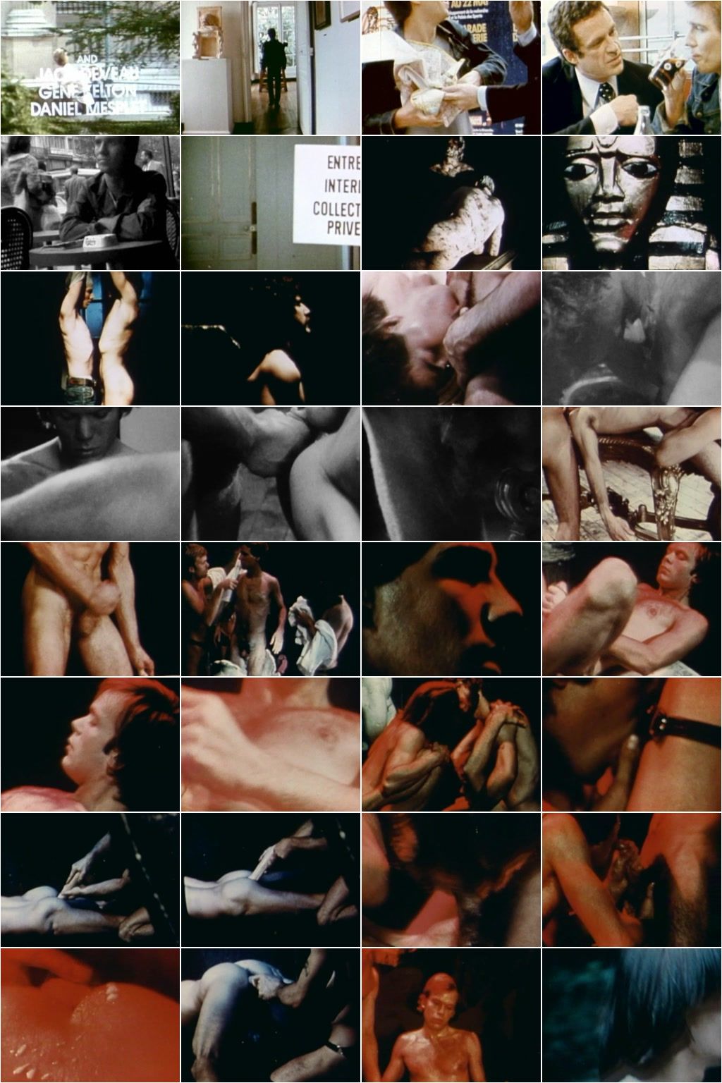 Description : An American student traveling in France finds himself one day in a Paris art museum. Wandering around, he comes upon an unlocked door to a private collection. A guard shoos him away, but his curiosity has gotten the best of him. He returns to the museum, managing to sequester himself there overnight. What he find sin the room is a collection of erotic male statues, which come to life and guide the boy from one sexual act into another. In the end, the boy becomes one of them, a statue. The film is seen from the boy's point of view, and takes on the feeling of one sexual act, an initiation into homosexuality