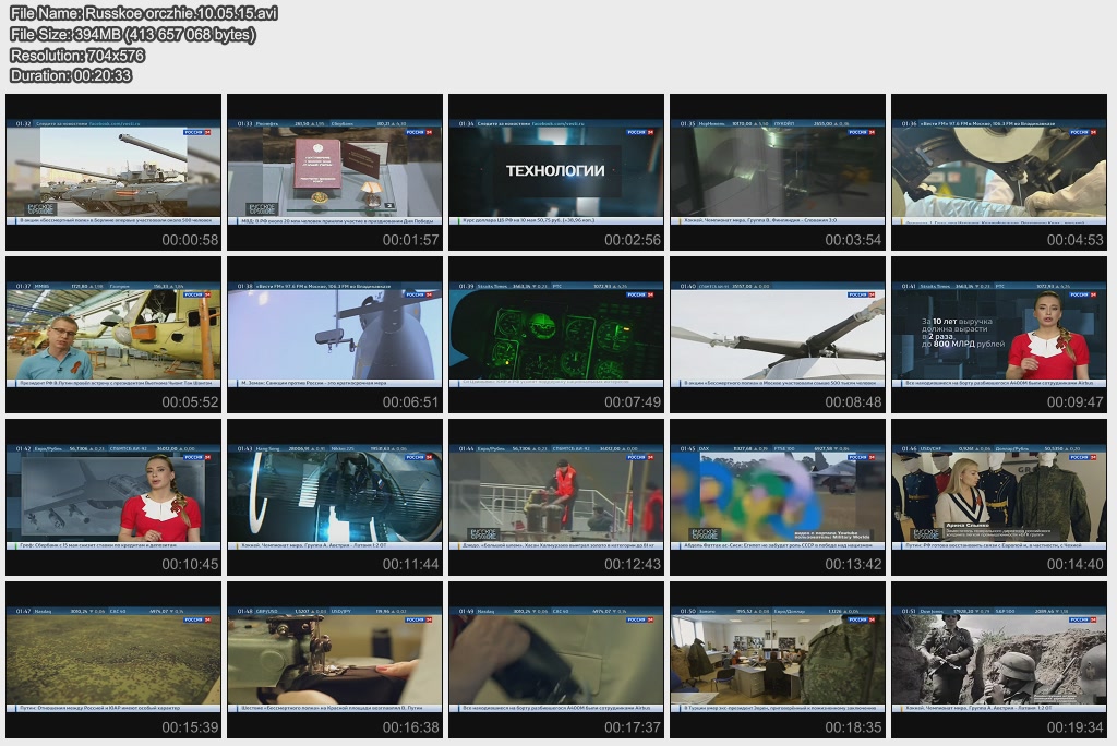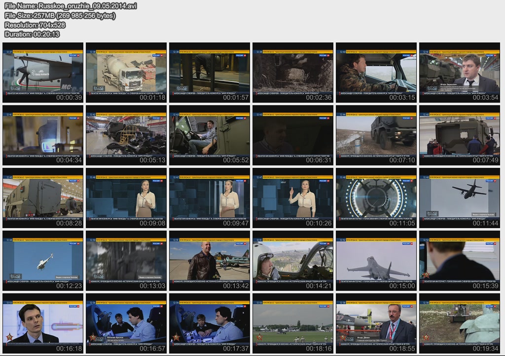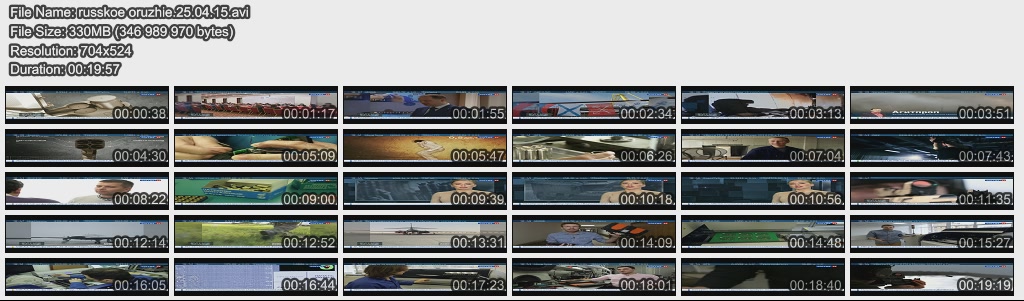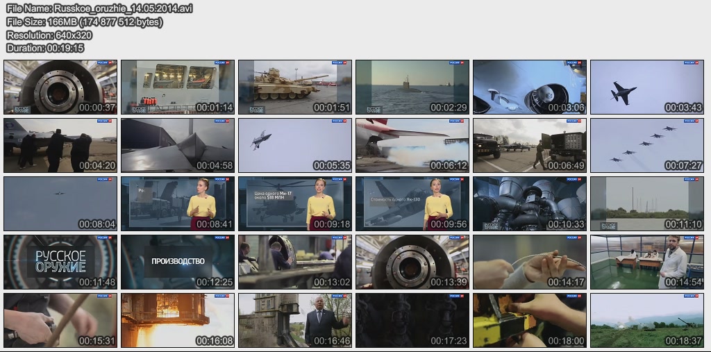 Информация о фильме.Название: Русское оружие Оригинальное название: Русское оружие Год выхода: 10.05.2015 Жанр: Документальный Страна: Россия Продолжительность: 00:20:34 Язык: Русский О фильме:-- Как оценили иностранные эксперты "Армату" и когда в армию прилетит "Ворон"? - об этом и многом другом в рубрике "Актуально". -- Несколько десятков тысяч деталей на каждый - Артем Потёмин ознакомился с полным циклом производства современных вертолетов. -- Что Франция собирается сделать с российскими вертолетоносцами типа "Мистраль"? - в обзоре мировых новостей. -- Красиво, а главное удобно! Из чего состоит новая российская военная форма и как ее шьют - узнал Сергей Лесковский . -- 70-летию Победы посвящается: реконструкция боя Великой Отечественной войны - в рубрике "Без комментариев". Файл:Качество: SATRip Формат: AVI Видео: MPEG-4, DivX, 704x576 , 1741 Kbps/, 25.00 fps Аудио: MP3, 48000 Hz, stereo, 128 kb/s Размер: 394 MB Скачать: Вам необходимо ЗАРЕГИСТРИРОВАТЬСЯ НА ФОРУМЕ, чтобы скачать файл.