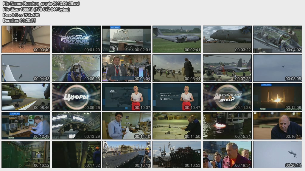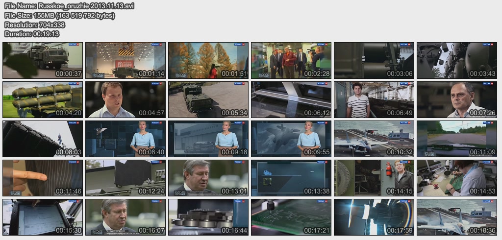 Информация о фильме.Название: Русское оружие Оригинальное название: Русское оружие Год выхода: 15.05.2013 Жанр: Документальный Страна: Россия Продолжительность: 00:20:48 Язык: Русский О фильме: Американский "Патриот" или российский "Антей": какая зенитно-ракетная система встанет на вооружение ПВО Турции. Запчасти - ваши, вертолеты - наши: первый российско-итальянский авиационный завод. Неземные технологии: как и где создаются космические спутники. Гроза всего живого: испытания "Терминатора". Файл:Качество: SATRip Формат: AVI Видео: MPEG4, 704x408, 1000 kb/s; 25.00 fps(r) Аудио: MP3, 48000 Hz, stereo, 128 kb/s Размер: 168 MB Скачать: Вам необходимо ЗАРЕГИСТРИРОВАТЬСЯ НА ФОРУМЕ, чтобы скачать файл.